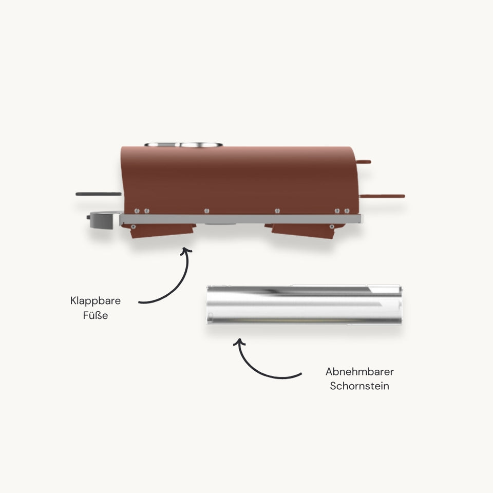 Der kompakte und praktische Pizzaofen Piana lässt sich dank seiner klappbaren Füße und seines abnehmbaren Kamins leicht verstauen. Ideal für perfektes Backen, egal wo Sie sich befinden!